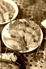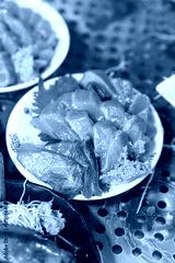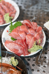 Fresh raw fish meat, Japanese sashimi food menu that prepared in dish for sale at fish market. Food and object, close-up with selective focus.