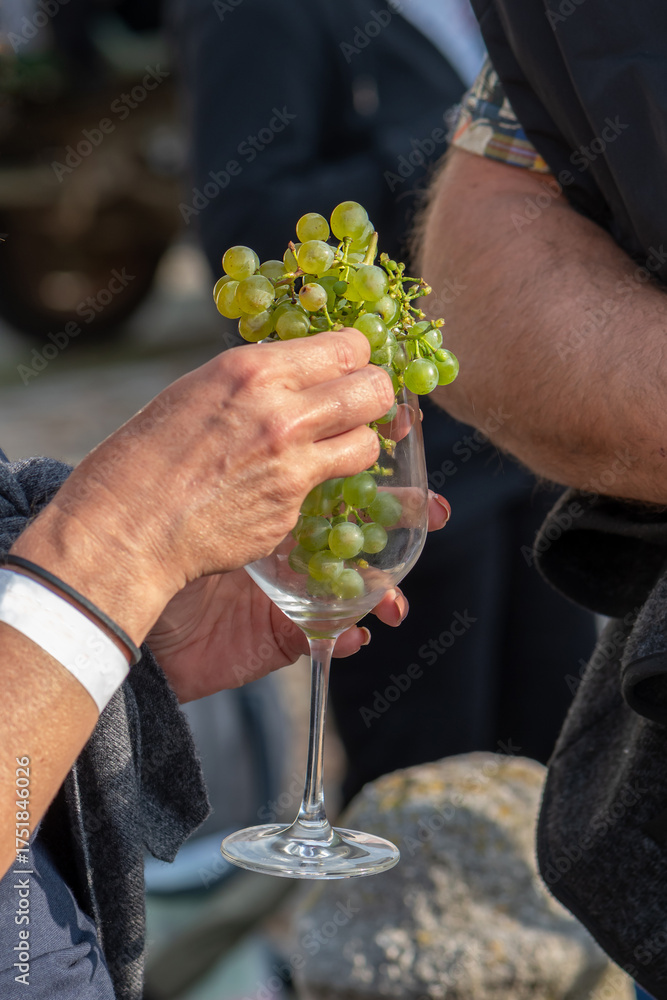 A hand holds a glass with a bunch of green grapes at a wine festival