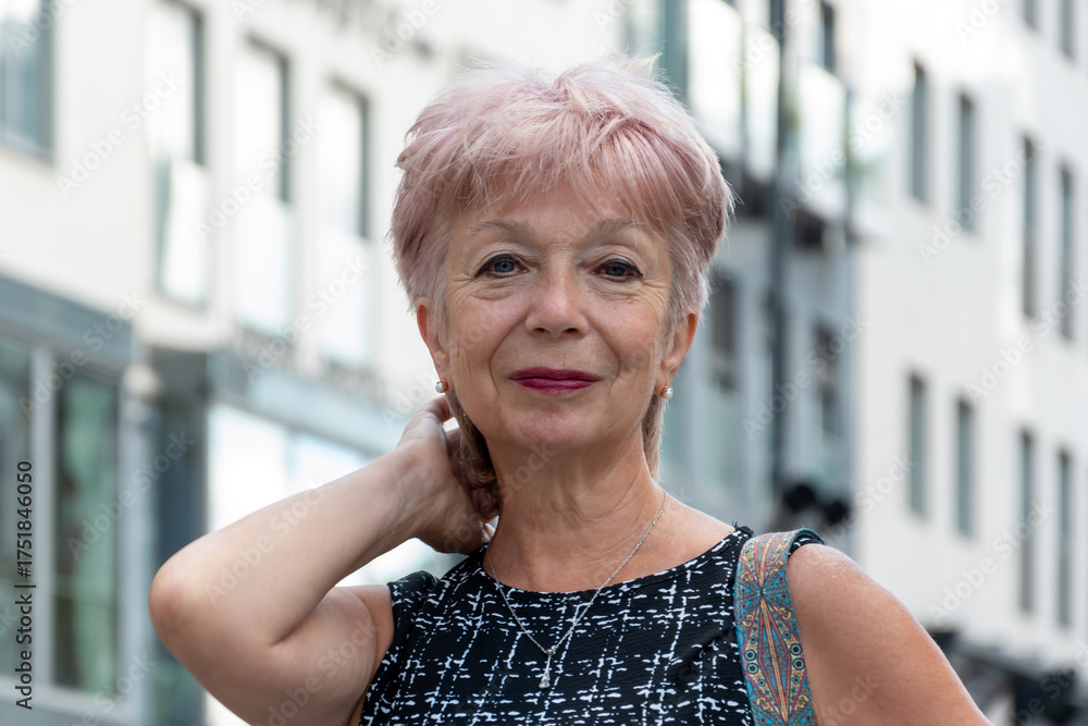 An elderly pensioner, aged 65 70, adjusts her hair while walking around the city.