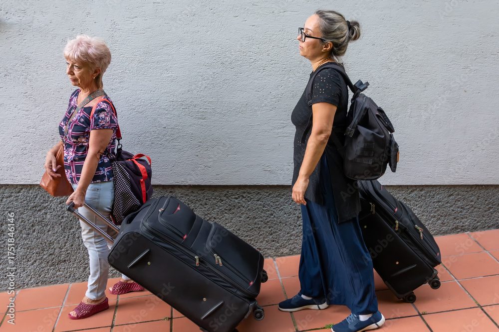 Two women with suitcases and backpacks walk along a city street