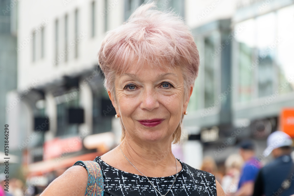 An elderly lonely woman with pink hair enjoys a walk in the center.