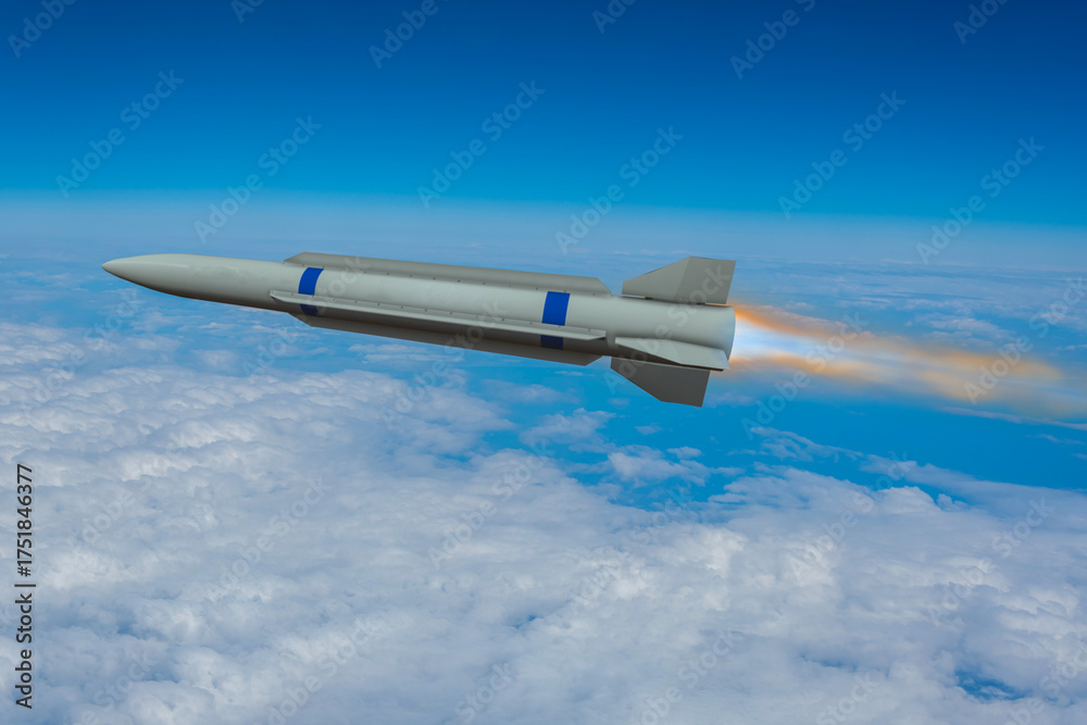 A hypersonic missile flies at high altitude above the clouds, leaving behind a bright jet trail.