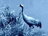 Żerujący Żuraw zwyczajny (Grus grus) na stawie bobrowym w wieczorowej porze.