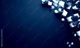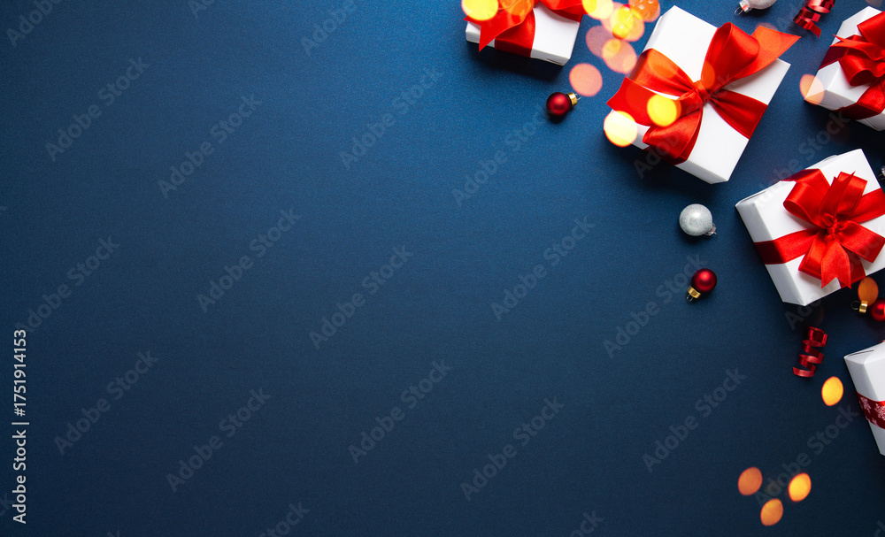 Merry Christmas and Happy Holidays greeting card, frame, banner. New Year. Red and white Christmas decorations and gifts on blue background top view. Winter xmas holiday celebration theme.