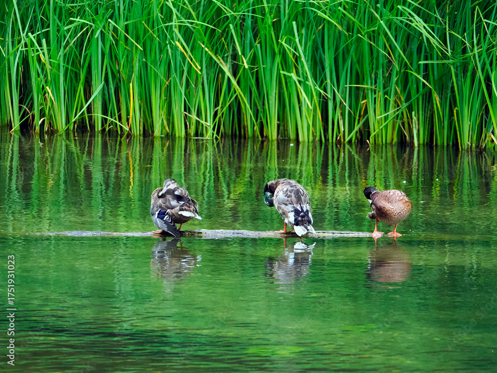 Krzyżówka zwyczajna (Anas platyrhynchos) podczas wypoczynku i żerowania w niewielkiej rzecew rezerwacie przyrody.
