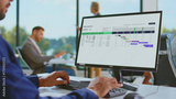 Business professional using a desktop computer to manage a project schedule and planning tasks with an organized gantt chart application in a modern office environment
