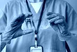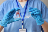 Female dentist with occlusal splint and plastic tooth on grey background, closeup