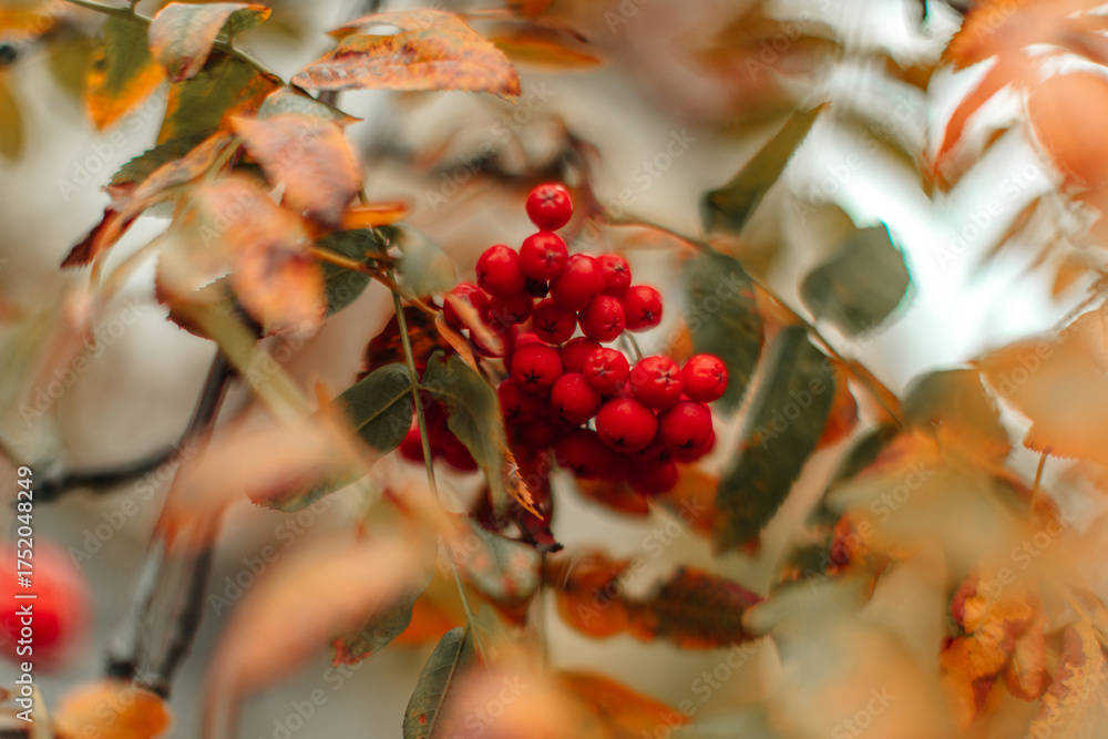 Red berries growing on a tree in the autumn season, a natural background for calendars and nature posters