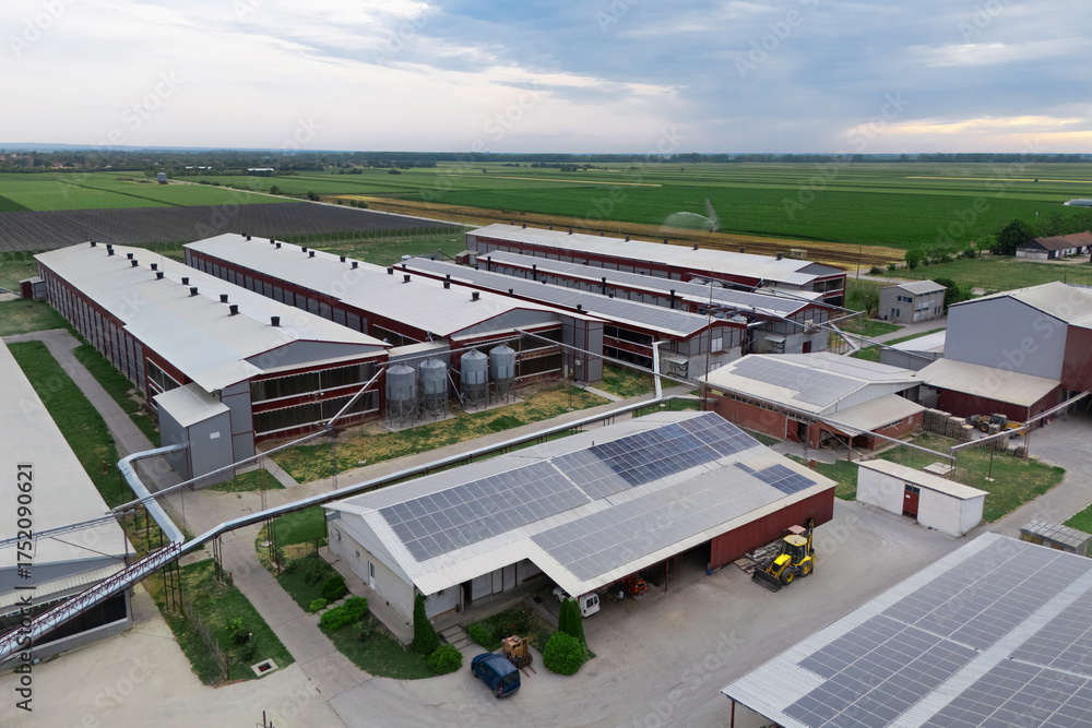 Modern poultry farm with solar panels. Factory using renewable energy. Aerial view