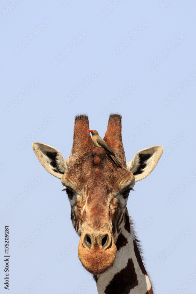 Reticulated Giraffe and Oxpecker bird. Portrait of face