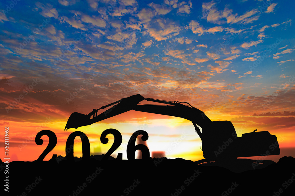 Concept happy new year 2026,crawler excavator silhouette with lift up bucket .On sunset backgrounds