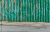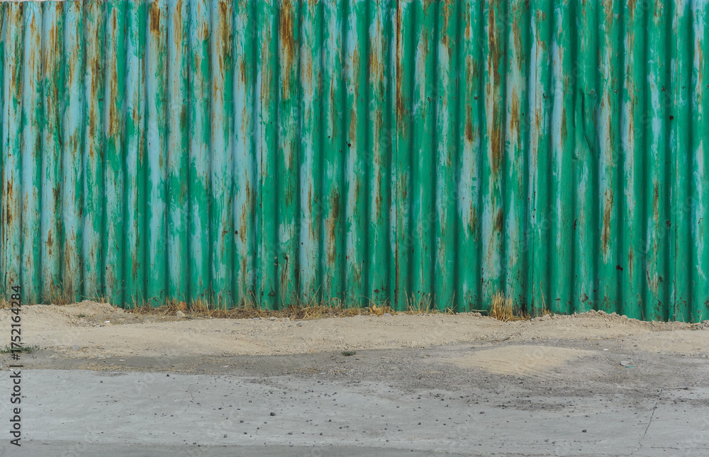 an old green and blue metal fence with rust