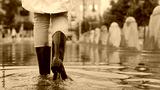 a man in rubber boots walks through the puddles of the city, big showers flooded the roads of the streets, a lot of water on the asphalt, splashes in different directions from a wet muddy puddle.