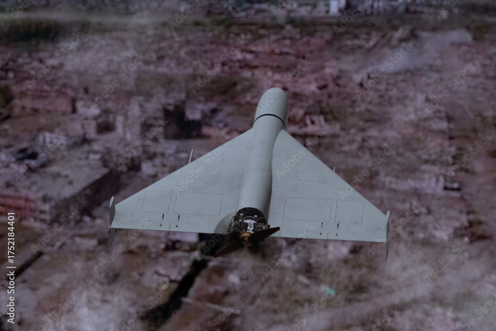 A combat drone is moving over the ruins and smoke of the destroyed city after the attack.