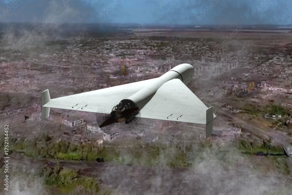 A white drone with a propeller flies through clouds of smoke over a ruined city