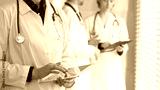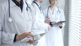 Medical professional using a digital tablet for patient care and data management, collaborating with doctors and healthcare workers in a modern clinic or hospital setting