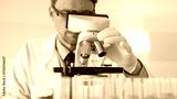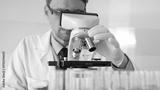 Scientific researcher wearing lab coat, glasses and white protective gloves carefully calibrating laboratory microscope, performing precision medical investigation. Medicine, healthcare and science