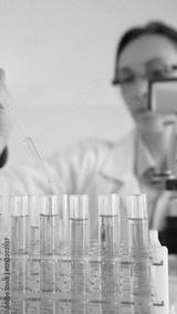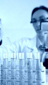 Female scientist in white lab coat pipetting blue liquid into test tubes, microscope visible amid sterile laboratory environment. Medicine, healthcare and science concept