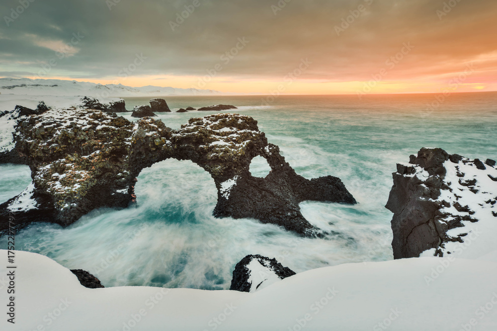 Sunset over Gatklettur Rock Arch in Snaefellsnes Peninsula, Iceland