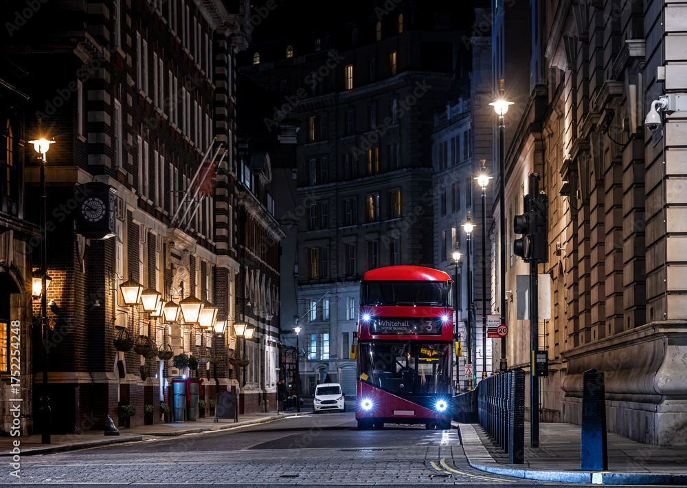 Classic London red bus navigates through a brightly lit street with Christmas decorations and busy foot traffic. Ideal for travel, holiday, or urban lifestyle themes.