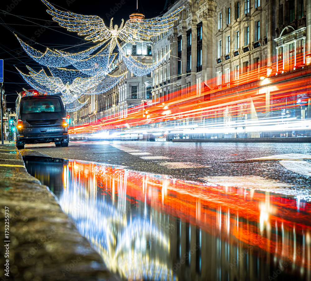 Classic London red bus navigates through a brightly lit street with Christmas decorations and busy foot traffic. Ideal for travel, holiday, or urban lifestyle themes.