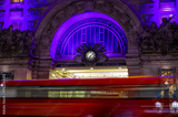 Classic London red bus navigates through a brightly lit street with Christmas decorations and busy foot traffic. Ideal for travel, holiday, or urban lifestyle themes.