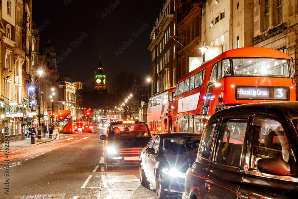 Classic London red bus navigates through a brightly lit street with Christmas decorations and busy foot traffic. Ideal for travel, holiday, or urban lifestyle themes.