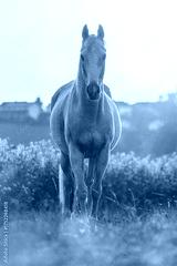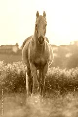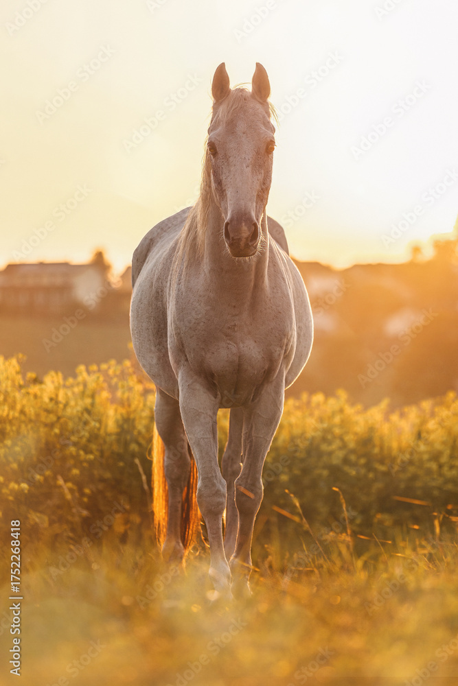 Elegant Arabian horse standing on hill during golden sunset with village and church tower in background