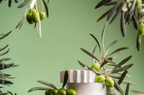 Fresh olive branches with green olives arranged around a white minimalist pedestal against a soft green background. Natural composition for skincare, organic products, Mediterranean cosmetics.
