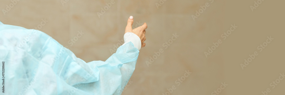 Female hand in blue medical gown giving thumbs up gesture on beige background.