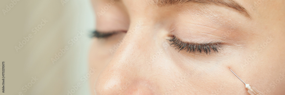 Close-up of young caucasian female receiving cosmetic injection under eye.