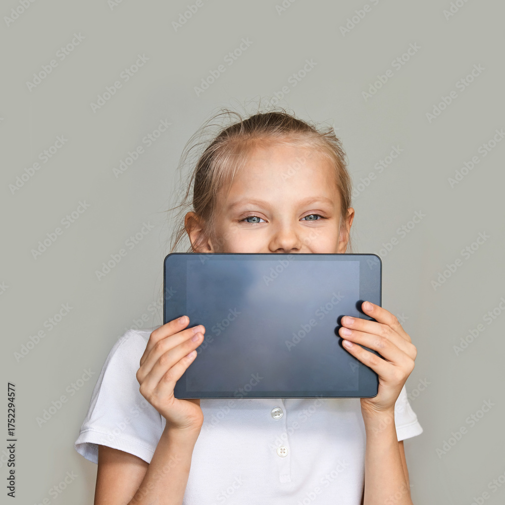 Caucasian young girl holding tablet and smiling in casual white shirt against gray background.