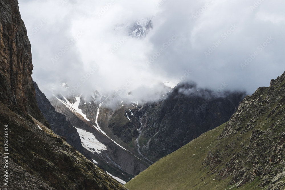 Mountain landscape with rocks and creeping fog. High peaks in the clouds, cold weather. Tourism in the mountains
