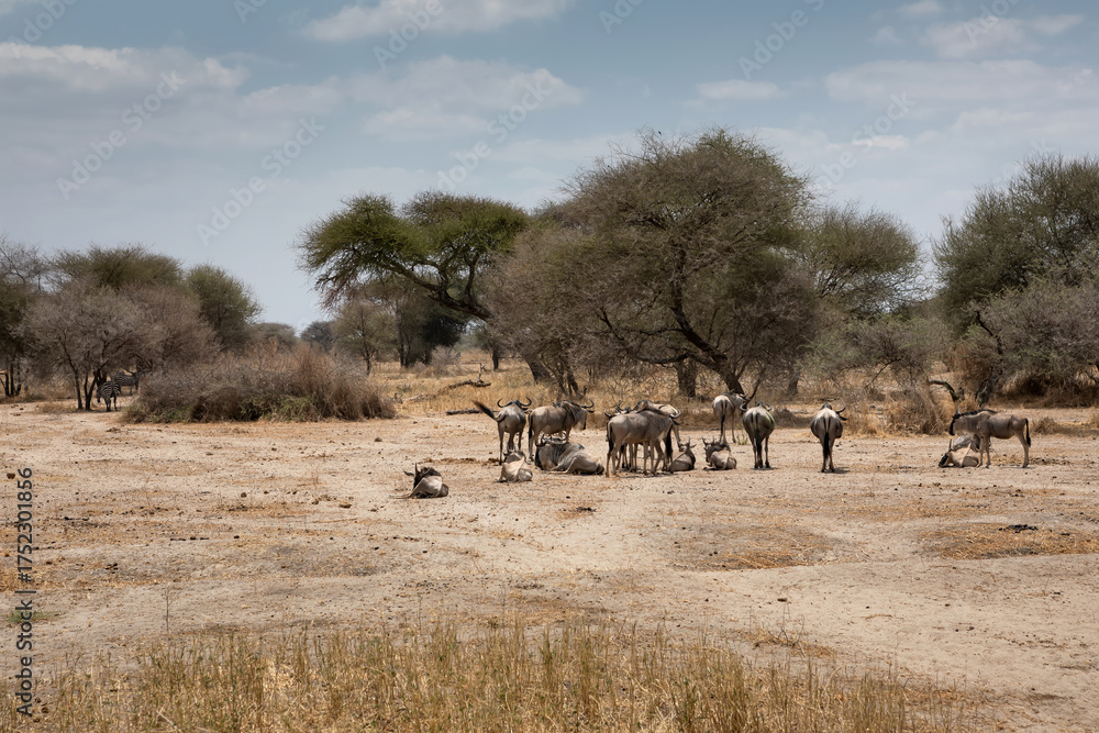 Beautiful wild animals in the African savannah. Sunny summer day. Nature of Tanzania.