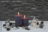 Christmas background: Christmas decoration with purple candles, Santa Claus and Christmas balls in the snow in front of a gray wall with space for text.