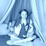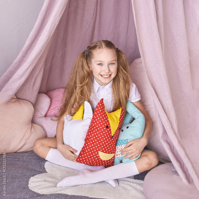 Young caucasian girl sitting in playful pillow fort with colorful cushions and pink curtains.