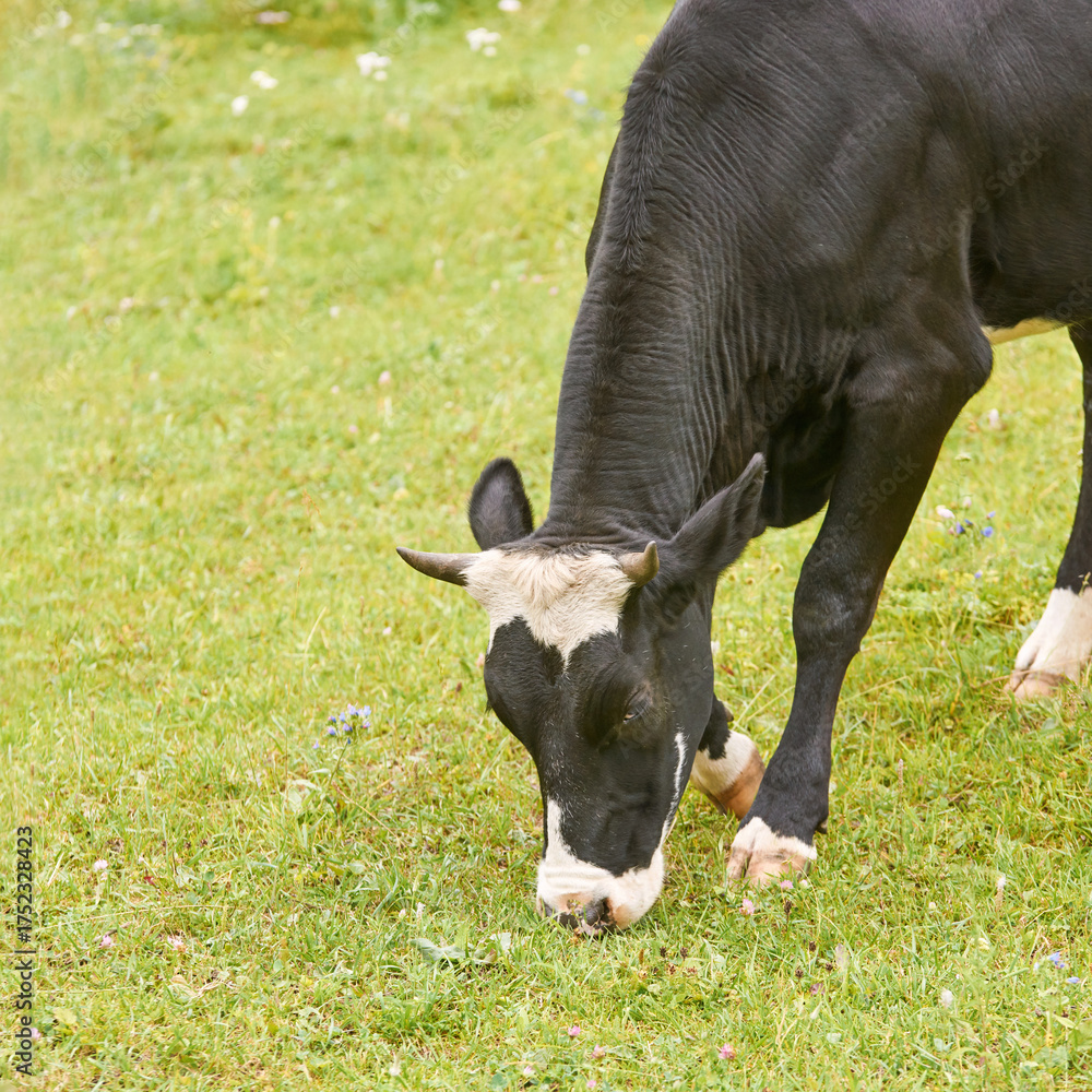 Black and white holstein cow grazing on green grass in peaceful pasture setting.
