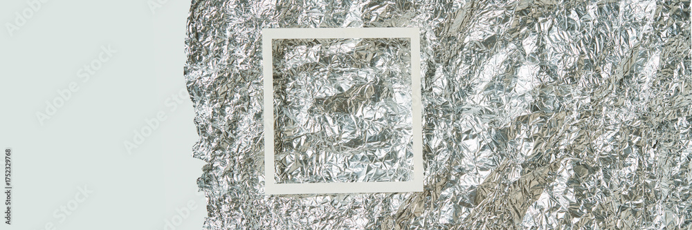 White frame on crumpled silver foil texture background abstract metallic surface.