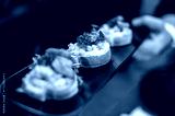 Gourmet bruschetta with creamy spread, microgreens, diced vegetables, seafood, and red roe on toasted bread, served on a black tray, held by hand. Elegant appetizer presentation.