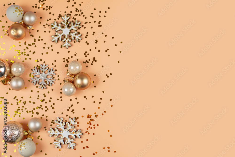 Top view vertical photo featuring variety of tree adornments, baubles, shimmering stars, snowflake accents, confetti on pastel backdrop holiday greetings or advert
