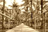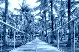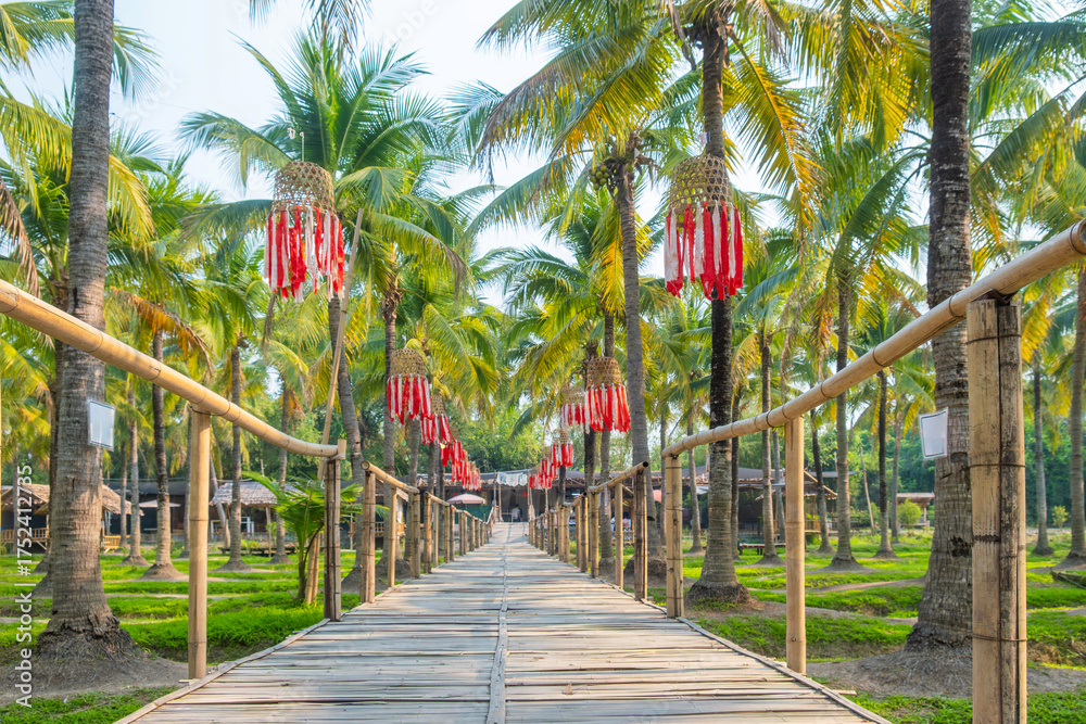 Bamboo walkway on coconut palm trees plantation and traditional red lanterns in Chiang Mai, Thailand, leading to Thai village. Tropical serenity, sustainable travel, eco-tourism