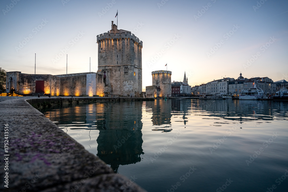 blue hour view of Port of La rochelle guarded by tour de la chaine and tour Saint Nicholas, France