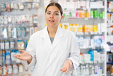 Portrait of positive female pharmacist who invites you to visit a pharmacy or a healing cosmetics store
