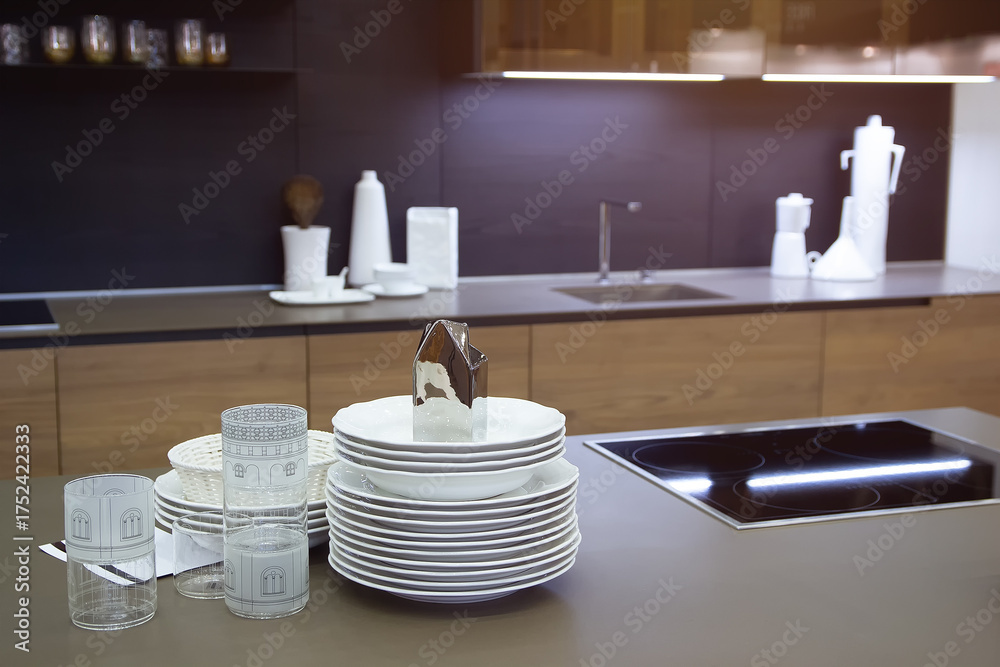 Dishes on the table of a modern kitchen