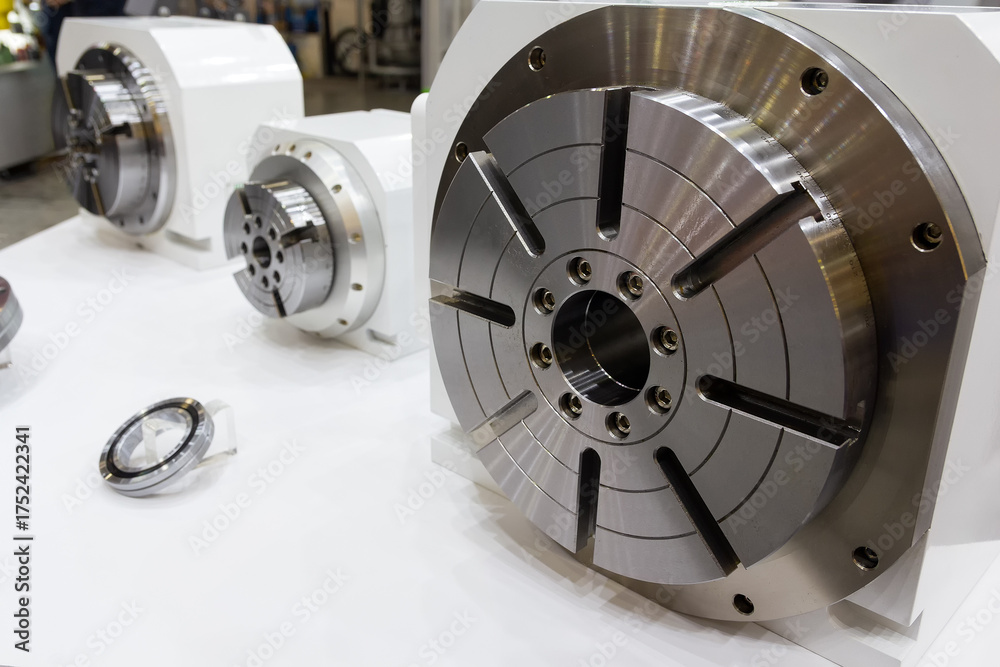 Components of a modern lathe in a showroom