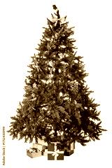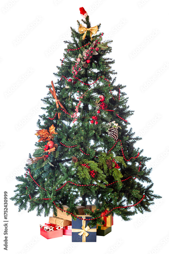 Decorated Christmas tree with presents isolated on white background. Home interior with decorated Christmas tree and gift boxes under it for the New Year celebration