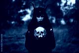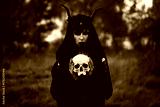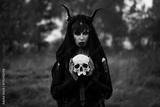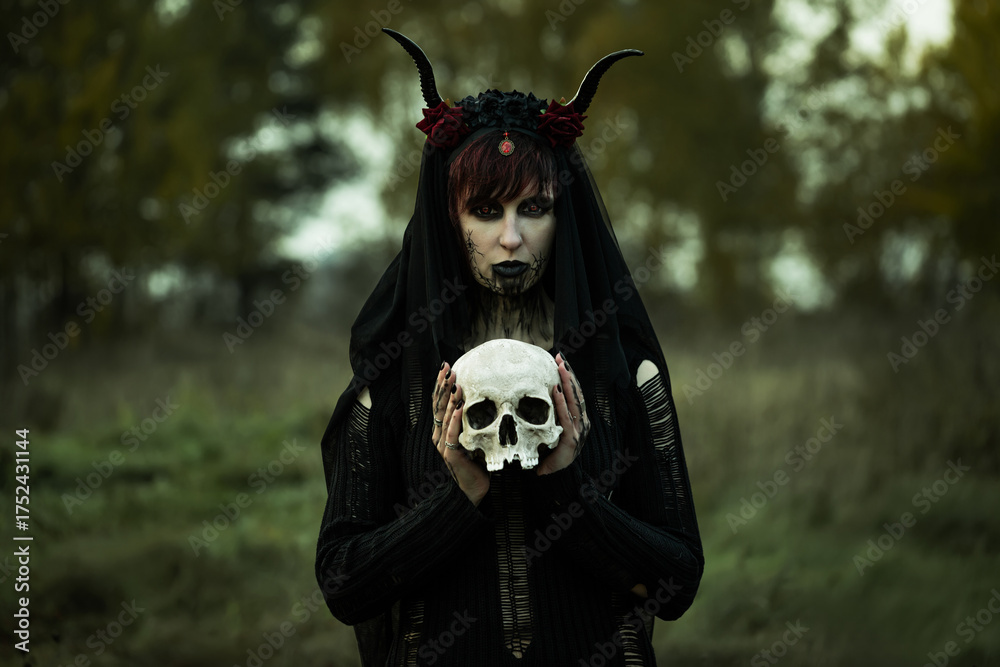 Halloween theme. Gothic woman, devil or witch with horns and red eyes holding human skull outdoors. Dramatic image