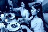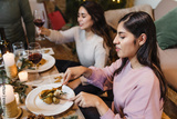Latin friends having christmas dinner at home in Mexico Latin America, group of hispanic young people eating in Holidays and thanksgiving