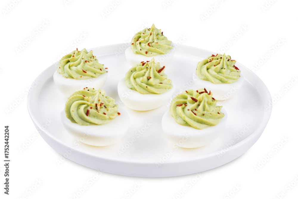 Avocado cream deviled eggs for Christmas holidays on a white isolated background