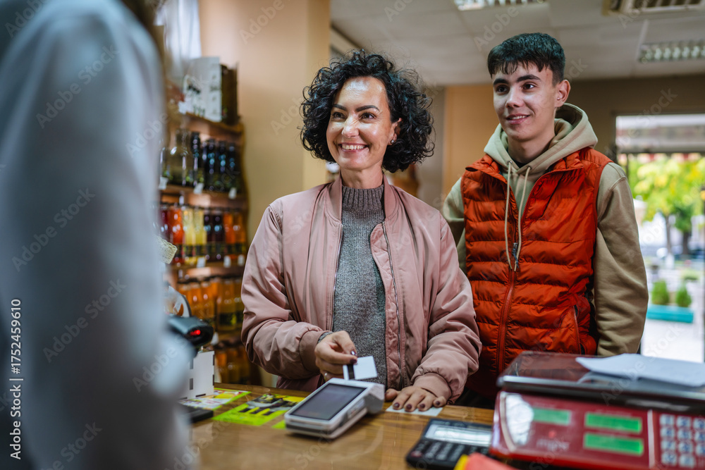 Mother and son paying with credit card at retail store checkout